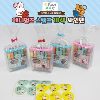 [날쌘거북이] 5000 애니멀즈 스탬프 18색 싸인펜 어린이집 유치원 생일선물 답례품 [리본끈완포장+메세지스티커2종], 1개, 랜덤
