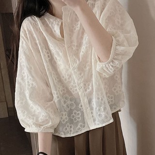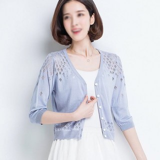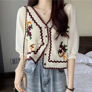 스타일아유 여자 여름 빈티지 자수 가디건 니트 카디건 얇은 여자 여름 플라워 펀칭에 짧은 상의 퍼프소매[AZG4CD0232]