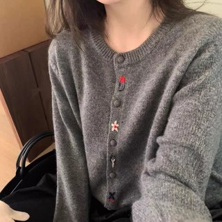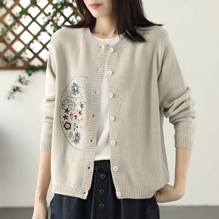 여성 라운드 넥 봄 가을 꽃 자수 니트 가디건 그레이