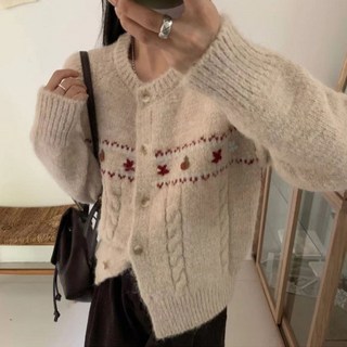 에쥬아 꽃자수 니트 가디건 레트로 꾸안꾸 데일리룩 꽈배기 플라워 니트 스웨터