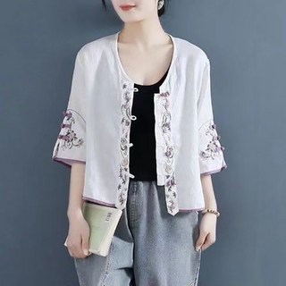 ORZQU 여름 여자 자수 단추 면 마 셔츠 가디건 루즈핏 숏 브이넥 톱