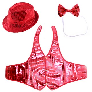 리빙다 반짝이모자 + 반짝이 조끼 M + 나비 넥타이 세트, 레드, 1세트
