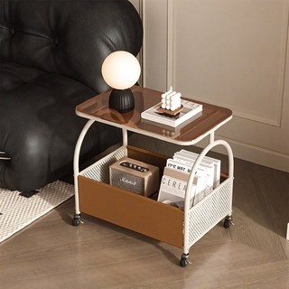 Bornoon 이동식 간편설치 거실 침대 쇼파 사이드 테이블, 화이트+브라운 유리