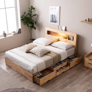 [삼익가구]러버 LED 4단 수납 원목 침대(매트제외-퀸), 내추럴